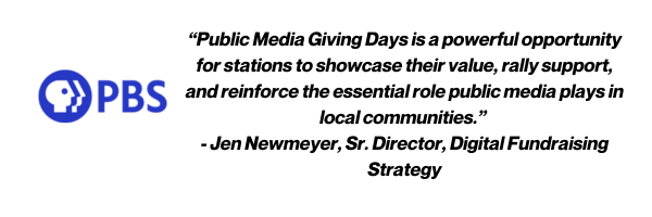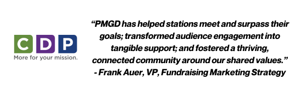CDP, APT, Greater Public, NPR and PBS are proud to present the fourth annual Public Media Giving Days (PMGD)! With your station’s participation — whether you were involved last year or not — the public media system can continue to advance this two-day tradition for local public media organizations to acquire donors, raise revenue and deepen local engagement.
